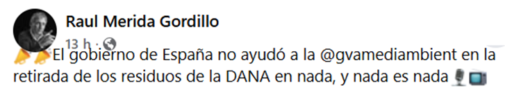 Entre estos últimos/as podemos incluir en primera línea a la delegada del gobierno Pilar Bernabé (la conectada ausente del CECOPI) y a la estadista Diana Morant, que ha dicho que las alertas despues del 29-O han funcionado, como si se hubiera dado una situación similar desde entonces. En circunstancias similares, con los mismos volúmenes, las inundaciones hubieran sido las mismas y si las victimas hubieran sido menos, sería por el miedo y desconfianza de la población, por el hecho de que se sabe que el gobierno de la nación no ha acometido las obras necesarias para evitarlo. Que el gobierno nos revienta a impuestos pero no nos protege. Es más, despues del desastre retrasó el auxilio a la población. Y durante las tareas de limpieza y reconstrucción no han ayudado y ha puesto todas las trabas que ha podido.https://www.facebook.com/raul.meridagordillo/videos/el-gobierno-de-espa%C3%B1a-no-ayud%C3%B3-a-la-gvamediambient-en-la-retirada-de-los-residuo/850008257365497/