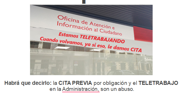 Y como la institución pública “más cercana” son los ayuntamientos, se debería comenzar por ellos y eliminar la CITA PREVIA. Y de paso, también el TELETRABAJO. Son una estafa.
