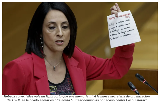 Rebeca Torró no recuerda como han podido desaparecer y aparecer las denuncias “intermitentes” (ahora sí, ahora no, ahora sí) presentadas por las presuntas acosadas contra Salazar “el Bello”. En la foto de cabecera, vemos que Torró, precavida, se anota “las cosas” para que no le pase lo que a su compañero y ministro para la Transformación Digital y más allá. Se anota que “ultraderecha” es (VOX) por si se le olvida. ¡Bien Rebeca! Siempre con un lápiz a mano.